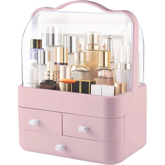 Description / Makeup Organizer, Modern Cosmetic Organizer Makeup Storage Holder, Display Make up Caddy Shelf Organization Boxes Case Dustproof w/Handle and Drawer Pink