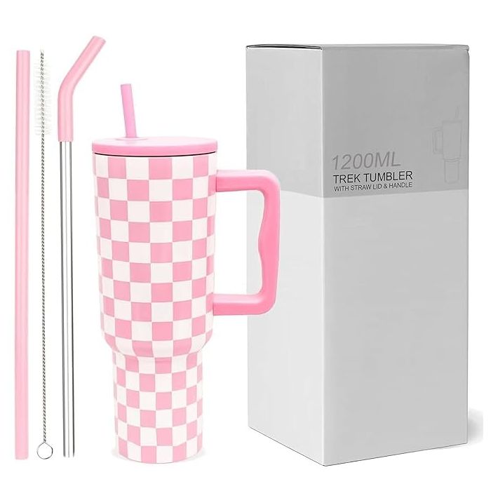 Description / Tumbler with lid and Straw 1200ML Cup Stainless Steel Vacuum Insulated Tumbler for Water, Iced Tea or Coffee 1.2L Office Gym Travelling Pink Checks